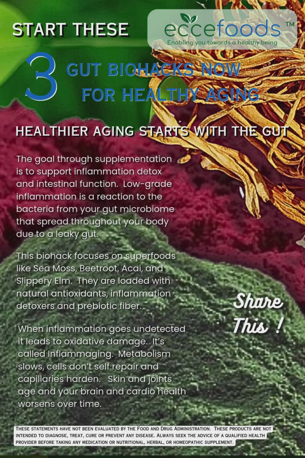 To beat Inflammaging the right strategy is to supplement with many types of superfoods that support gut health as well.